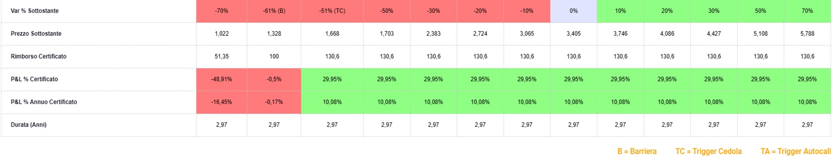 Una barriera al 40% degli strike price significa posizionarle al di sotto dei minimi del 2022 per Intesa Sanpaolo (1,3262 euro) e Mediobanca (5,382 euro) ed in area dei minimi per Banco BPM (2,434 euro), mentre per Unicredit (tuttora in un trend rialzista quasi inarrestabile) questa cade a 13,538 euro. La durata massima del prodotto è pari a tre anni (scadenza 25 marzo 2027), con il capitale protetto fino a ribassi del 61% del worst of Intesa Sanpaolo (tenuto conto dei valori attuali); al di sotto del livello barriera, il valore di rimborso del certificato verrà invece diminuito della performance negativa del titolo worst of, che verrà calcolata a partire dal livello low strike: nel caso di un -70% dalle quotazioni di Intesa Sanpaolo, il rendimento del certificato sarebbe pari al -48,91%, senza considerare le eventuali cedole incassate. Il certificato è quotato sul Sedex ad un prezzo lettera prossimo alla parità, con un rendimento ottenibile dall’investitore pari al 10% annualizzato, in caso di mantenimento della barriera a scadenza.