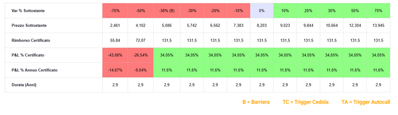 Il rischio scende ulteriormente, non tanto per la barriera capitale che viene per tutti posizionata al 50%, quanto sulla scelta della tipologia di cedola che nello specifico è incondizionata, ovvero pagata in ogni caso in forma certa a prescindere del buono o cattivo andamento dei sottostanti. Mettendo a sistema sull’analisi di scenario il mix appena citato, ovvero bassa barriera e cedola mensile incondizionata associata ad una scadenza di poco meno di tre anni, spicca inevitabilmente il carattere di forte resilienza e asimmetria che, come è sempre utile specificare, è tangibile sia sulla fotografia a scadenza ma anche sulla resilienza dei prezzi nel mark-to-market del certificato in presenza di mercati ribassisti.